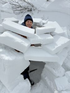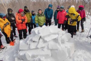 鈴木会長には会の設立時の文筆家、岡田喜秋氏の話を聞く。ちょうど絢子さんが、岡田氏著作の一部を持ってきて見せてくれた。旧制松本高校から東北大学、学徒出陣のあと焦土の仙台に戻って街を囲む山並みに惹かれた経緯が書いてあった。コミュニティーの創世神話を聞くのが好きだ。岡田氏も、すみかの街から見える山並みの、山麓を含めた旅に魅入られたのだった。共感である。そんな冬の旅には、この地域なら、イグルーがぴったりなんだよね。