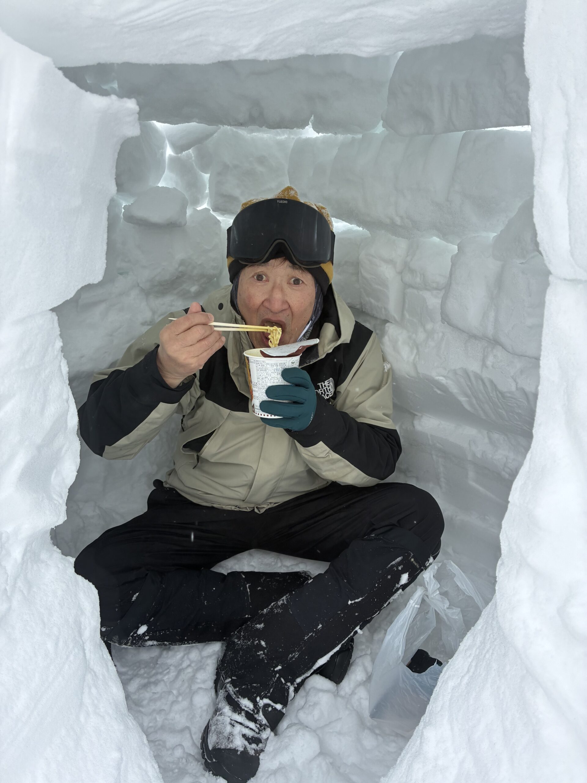 14時半に聖山平の小屋に移動して、そこでイグルー泊する7人5つを更に作る。たか、テル、マイ、ゲキ、福井、みよこ、山上さんが、暗くなるまでに完成。晩御飯後に次々イグルー泊に出撃していった。