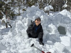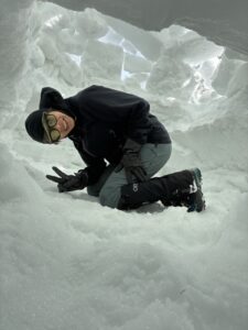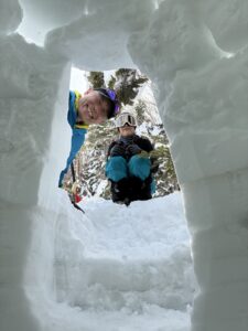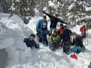 オータさんはなかなか長いブロック取れず場所も変えてみたけど、トレンチきちっとやって、最後の屋根は、薄くて軽いフレークで塞いで完成。全員時間内に作り終えて14時下山できた。みんな喜んでうれしい。